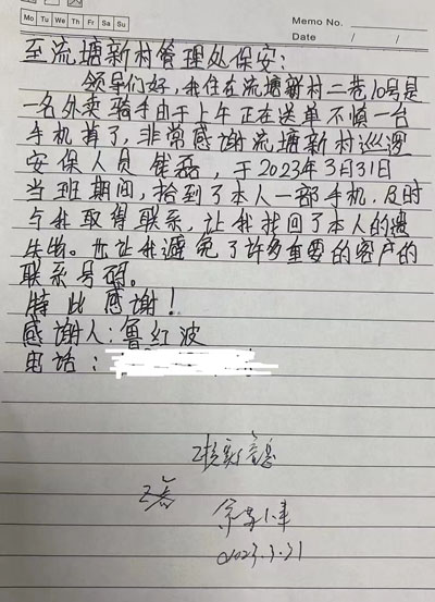 外賣騎手致信感謝我司鐵保宏泰深圳保安公司安保隊員錢磊同志拾金不昧。