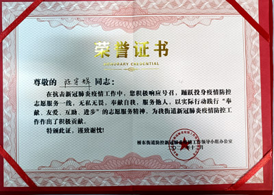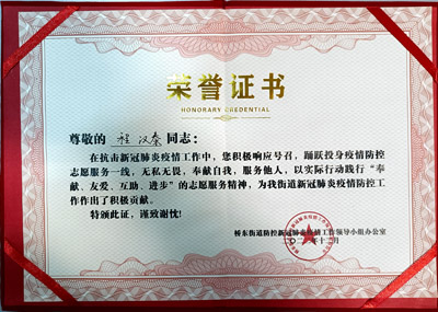 熱烈祝賀我司鐵保宏泰深圳保安公司的優秀安保護衛人員在抗擊新冠肺炎疫情工作中,積極響應號召,踴躍投身疫情防控志愿服務一線,無私無畏,奉獻自我,服務他人,以實際行動踐行“奉獻、友愛、互助、進步”的志愿服務精神,為我街道新冠肺炎疫情防控工作作出了積極貢獻。特頒發榮譽證書。