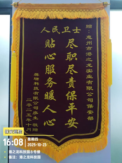 鐵保宏泰深圳保安公司安保隊員協(xié)助屏研科技追回被盜物品的行動,盡顯責任擔當與服務熱忱,特此港之龍屏研科技深表感謝致送"盡職盡責保平安 貼心服務暖人心"保安部錦旗。